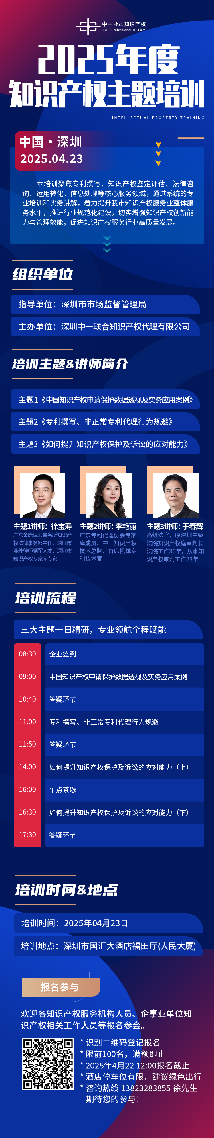 本次培训聚焦知识产权鉴定评估、法律咨询、运用转化、信息处理,专利撰写、非正常专利代理行为规避,以及如何提升知识产权保护及诉讼的应对能力等多个核心内容。培训详情及报名方式见下图: